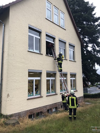 Wie sie es gelernt hatten, verließen die Schülerinnen und Schüler zusammen mit ihren Lehrkräften ruhig und diszipliniert ihren Klassenraum und stellten sich klassenweise auf dem Sportplatz auf. Nun erwartete die Kinder die zweite Überraschung des Tages: Es ertönte jetzt auch der Frielendorfer Feueralarm und wenige Minuten später kam die Feuerwehr mit zwei Fahrzeugen angefahren. Plötzlich sahen die Kinder, dass sich noch eine Lehrerin im Klassenzimmer befand – diese musste nun von der Feuerwehr gerettet werden (zum Glück war es ja nur eine Übung und es gab kein echtes Feuer). Gespannt verfolgten die Kinder die Rettungsaktion. Zum Abschluss durften sich noch alle Kinder das große Feuerwehrauto auf dem Lehrerparkplatz anschauen. Die seitlichen Türen waren offen, sodass die Kinder genau sehen konnten, was sich in so einem Feuerwehrauto befindet.