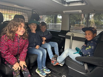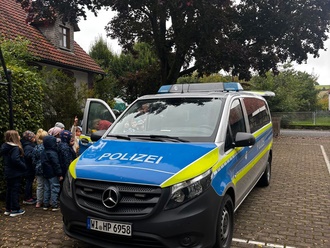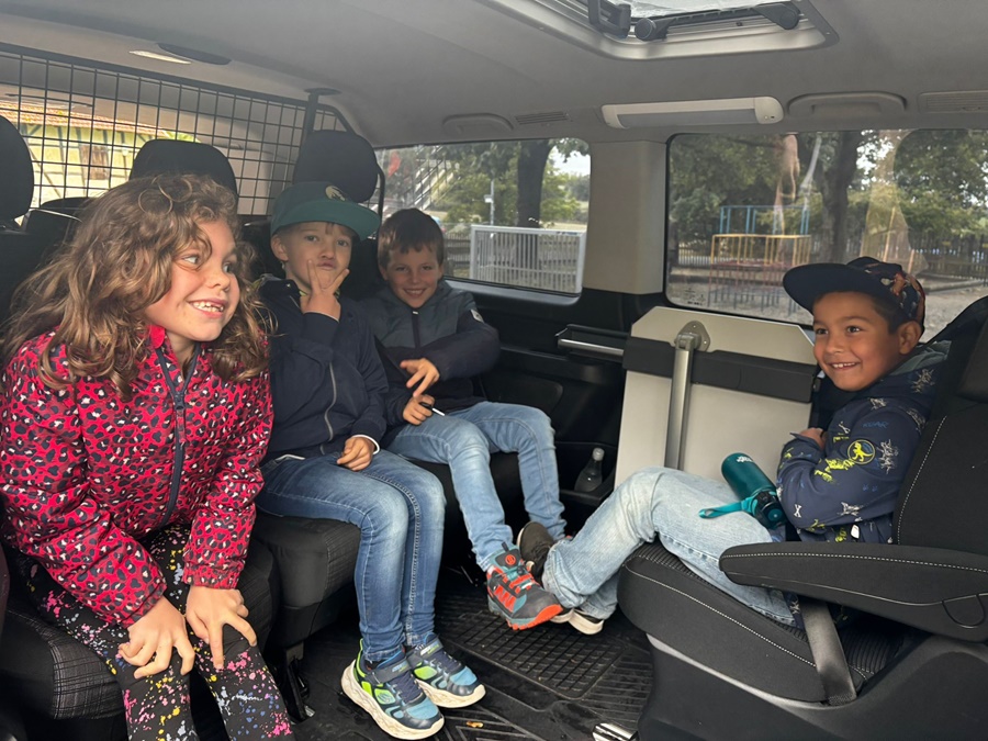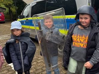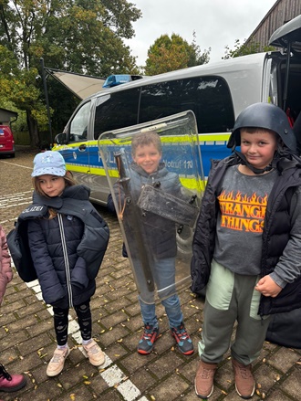 Anschließend hatten wir die Möglichkeit den Einsatzwagen aus nächster Nähe zu betrachten. Der Polizist zeigte uns, wie die verschiedenen Geräte im Fahrzeug funktionieren und welche besonderen Gegenstände im Auto verstaut sind. Besonders spannend war es für die Kinder, als sie die Möglichkeit hatten, die Schutzausrüstung selbst anzuziehen und sich wie echte Polizisten zu fühlen.