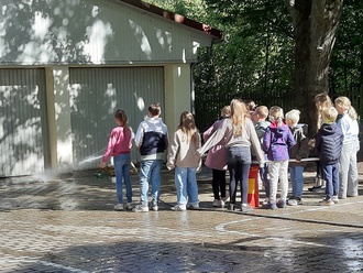An unserer letzten Station hatten die Schülerinnen und Schüler besonders viel Spaß! Mit einem echten Feuerwehrschlauch konnten sie Wasser auf kleine Flaschen spritzen. Es fühlte sich an wie ein kleiner Wettbewerb, denn das Ziel war es, die Flaschen umzuwerfen, um „das Feuer“ zu löschen.