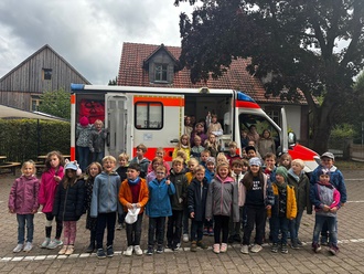 Das Testen der Bahre im Rettungswagen löste große Begeisterung bei den Kindern aus. Jeder von ihnen wollte dies einmal ausprobieren. Ein weiterer Höhepunkt war das Anlegen von Verbänden. Einige Kinder durften selbst Hand anlegen und lernten, wie man einfache Verletzungen versorgt.
