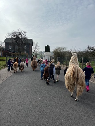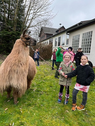 Am 19.03.24 war es endlich soweit: Gerhard Ringk besuchte mit seinen Alpakas und Lamas die Ahornschule in Großropperhausen und sorgte für strahlende Kinderaugen.