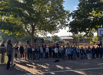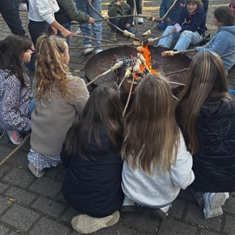 Feuerschalen wurden auf dem Schulhof aufgestellt und die Kinder konnten an langen Stöcken Marshmellows und Stockbrot grillen. Auch Kartoffeln wurden geröstet und dann verzehrt. Die Kinder hatten großen Spaß an den Feuerschalen, auch wenn es ein wenig Geduld erforderte, bis das Stockbrot über der Flamme perfekt geröstet war.
