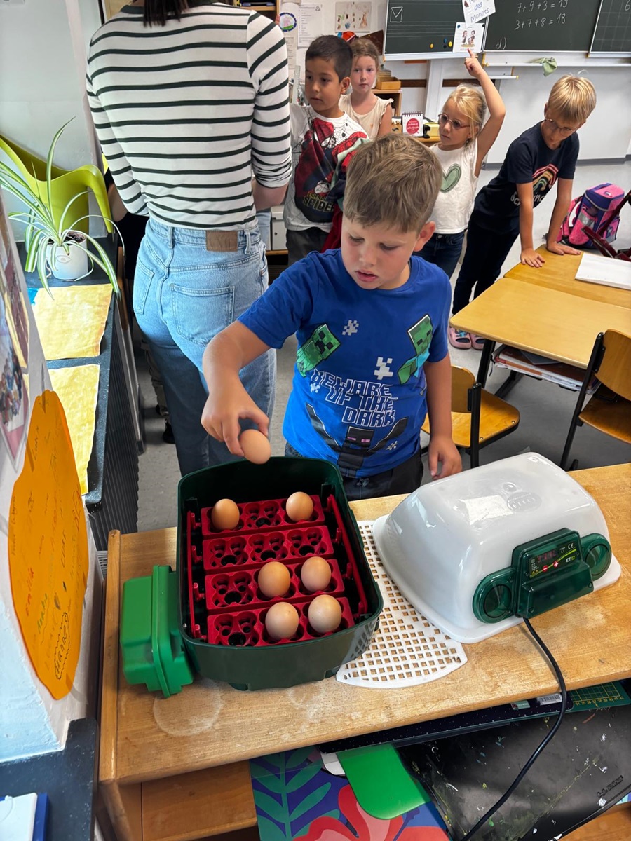 Die Freude war riesig, als nach 21 Tagen das erste Küken schlüpfte! Die Kinder der Ahornschule waren ganz aufgeregt und haben dem kleinen Küken den Namen Bernd gegeben.