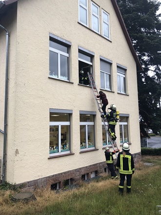 Wie sie es gelernt hatten, verließen die Schülerinnen und Schüler zusammen mit ihren Lehrkräften ruhig und diszipliniert ihren Klassenraum und stellten sich klassenweise auf dem Sportplatz auf. Nun erwartete die Kinder die zweite Überraschung des Tages: Es ertönte jetzt auch der Frielendorfer Feueralarm und wenige Minuten später kam die Feuerwehr mit zwei Fahrzeugen angefahren. Plötzlich sahen die Kinder, dass sich noch eine Lehrerin im Klassenzimmer befand – diese musste nun von der Feuerwehr gerettet werden (zum Glück war es ja nur eine Übung und es gab kein echtes Feuer). Gespannt verfolgten die Kinder die Rettungsaktion. Zum Abschluss durften sich noch alle Kinder das große Feuerwehrauto auf dem Lehrerparkplatz anschauen. Die seitlichen Türen waren offen, sodass die Kinder genau sehen konnten, was sich in so einem Feuerwehrauto befindet.