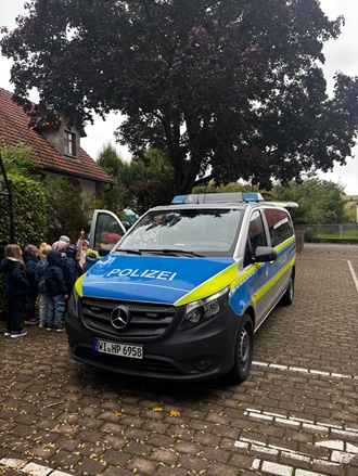 Anschließend hatten wir die Möglichkeit den Einsatzwagen aus nächster Nähe zu betrachten. Der Polizist zeigte uns, wie die verschiedenen Geräte im Fahrzeug funktionieren und welche besonderen Gegenstände im Auto verstaut sind. Besonders spannend war es für die Kinder, als sie die Möglichkeit hatten, die Schutzausrüstung selbst anzuziehen und sich wie echte Polizisten zu fühlen.