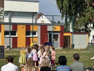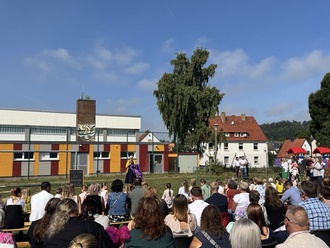 Dieser besondere Tag begann mit einem Gottesdienst in der Klosterkirche in Spieskappel, der von Pfarrer Firnges als Vertreter der evangelischen Kirche sowie von Pater Aloisius als Vertreter der katholischen Kirche sehr abwechslungsreich gestaltet wurde. Anschließend wurden die neuen Schulkinder und ihre Familien auf dem Schulgelände von der Schulleiterin Saskia Krössin-Schmidt herzlich begrüßt. In ihrer Rede nahm sie den Kindern die Angst vor dem Schulanfang. Für besondere Stimmung sorgten auch die Klassen 2a und 2b, die zwei fröhliche Lieder vorbereitet hatten. Außerdem führten sie ein kleines Theaterstück auf, das mit den Worten „Willkommen in der Schule!“ endete.