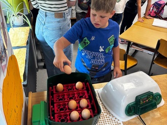 Die Freude war riesig, als nach 21 Tagen das erste Küken schlüpfte! Die Kinder der Ahornschule waren ganz aufgeregt und haben dem kleinen Küken den Namen Bernd gegeben.