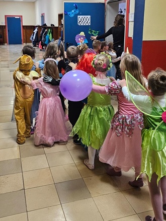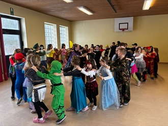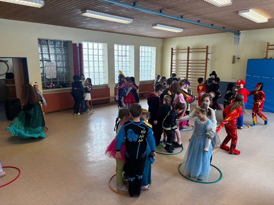 Danach ging es in die Turnhalle! Dort haben wir fröhlich getanzt und viele lustige Faschingsspiele gespielt. Die Musik hat alle zum Mitmachen animiert! Die Kinder hatten eine tolle Zeit, voller Lachen und Freude.