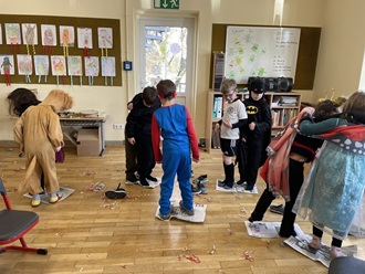 Einen fröhlichen und bunten Schulvormittag erlebten die Kinder der Palmbergschule am Rosenmontag. In allen Klassen waren fantasievolle Kostüme zu sehen – von Prinzessinnen und Superhelden bis hin zu Tieren und Zauberwesen.