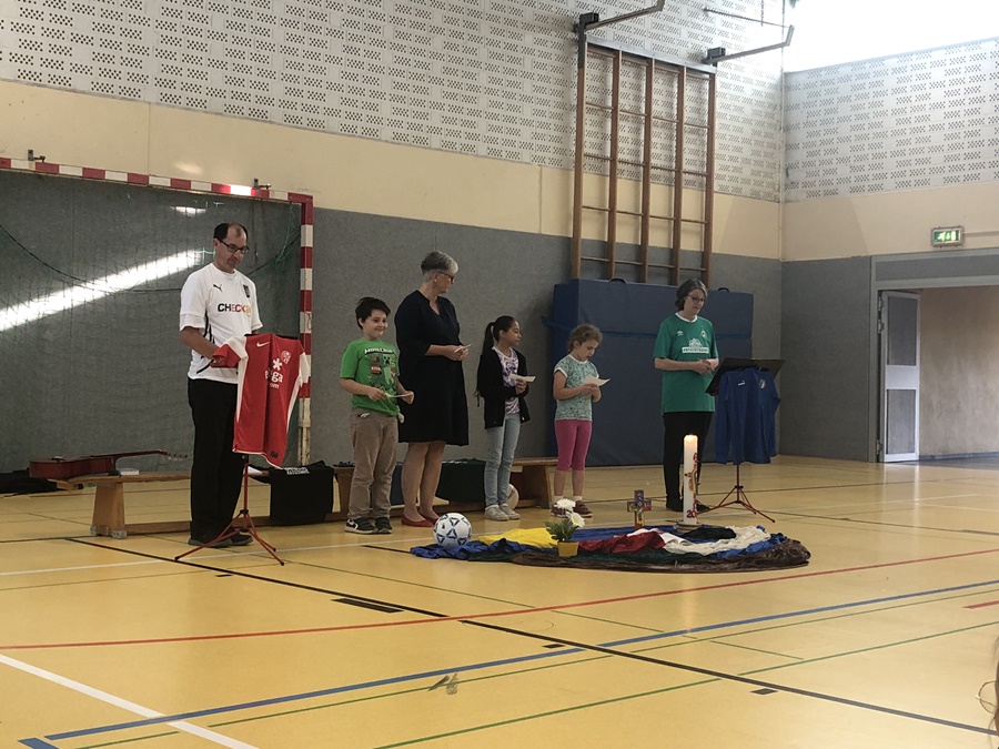 Zum diesjährigen Schuljahresanfangsgottesdienst, der in diesem Jahr ganz unter dem Motto „Fußball“ stand, versammelten sich die Kinder der Klassen E2 bis 4 mit ihren Lehrerinnen in der Turnhalle. Pfarrer Pfirnges und Gemeindereferentin Gabi Döll gestalteten einen lebendigen Gottesdienst, in den die Kinder mit Bewegungsliedern, einem Fußballquiz und dem Vorlesen von Fürbitten miteinbezogen wurden. Pfarrer Firnges gab den Kindern den Wunsch mit auf den Weg, dass es ihnen im neuen Schuljahr gelingen möge, als Klassengemeinschaft zusammenzuhalten und gemeinsam an ihren Zielen zu arbeiten.